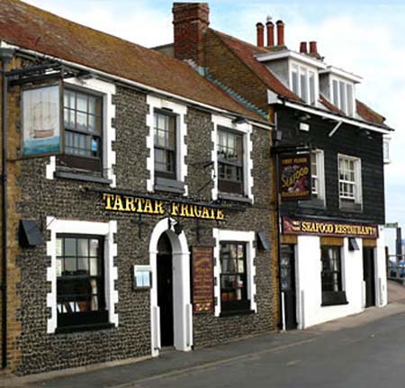 into the main street and zigzagging along the top of the white chalk cliff. And, down Harbour Street, as it bends round to the left still stands the Tartar Frigate, which Dickens described as: "the